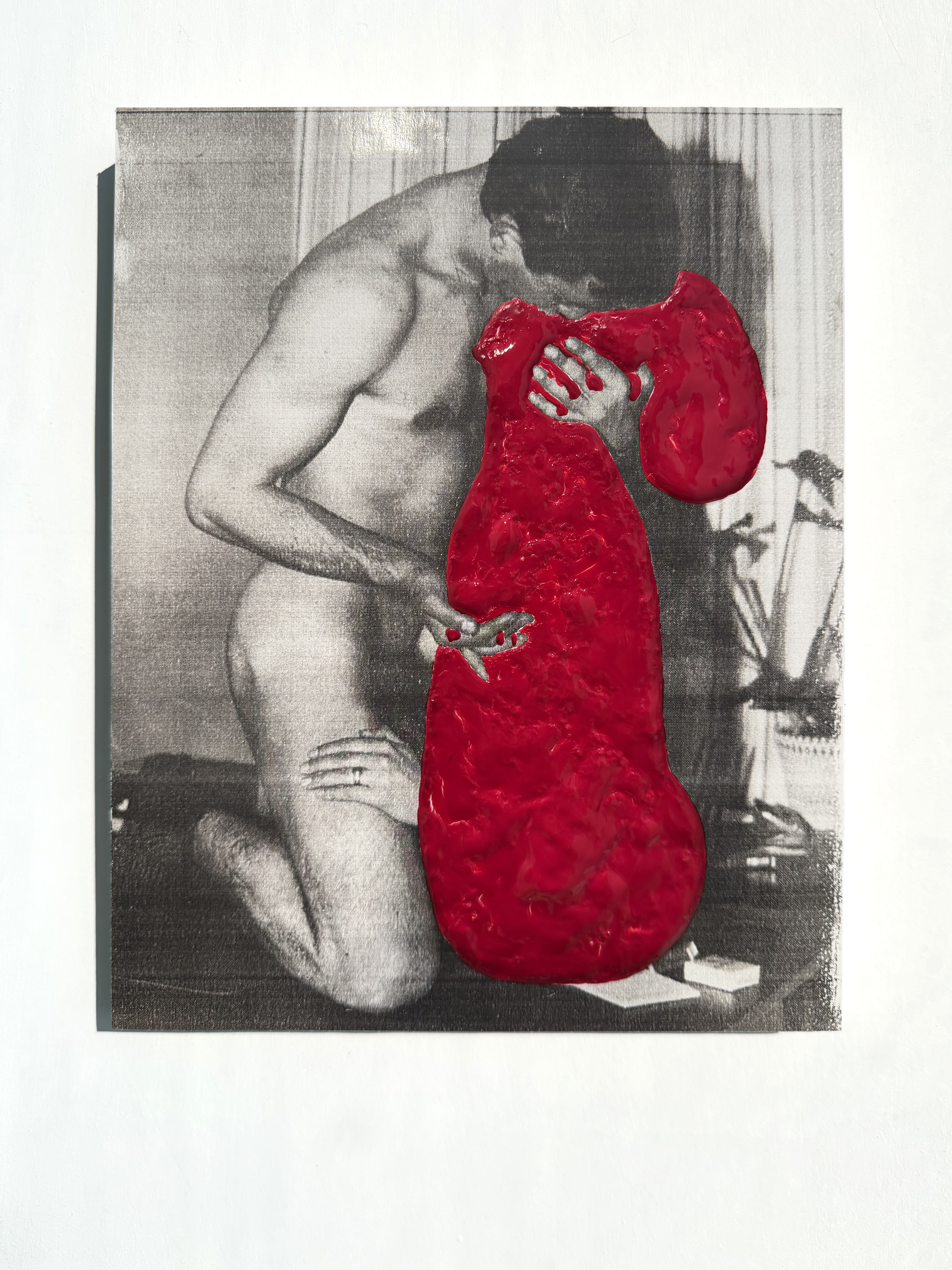 The improvement in the handling of the hands is decisive. Where previously the photographic limbs and the excised voids in the red mass seemed to quarrel, they now collaborate. The relation reads as touch rather than obstruction. The red presence is no longer simply plastered over the figure; it is held, steadied, almost indulged. An unexpected intimacy emerges. The shape ceases to resemble censorship and begins to resemble something helpless—something unable to remain upright without assistance.