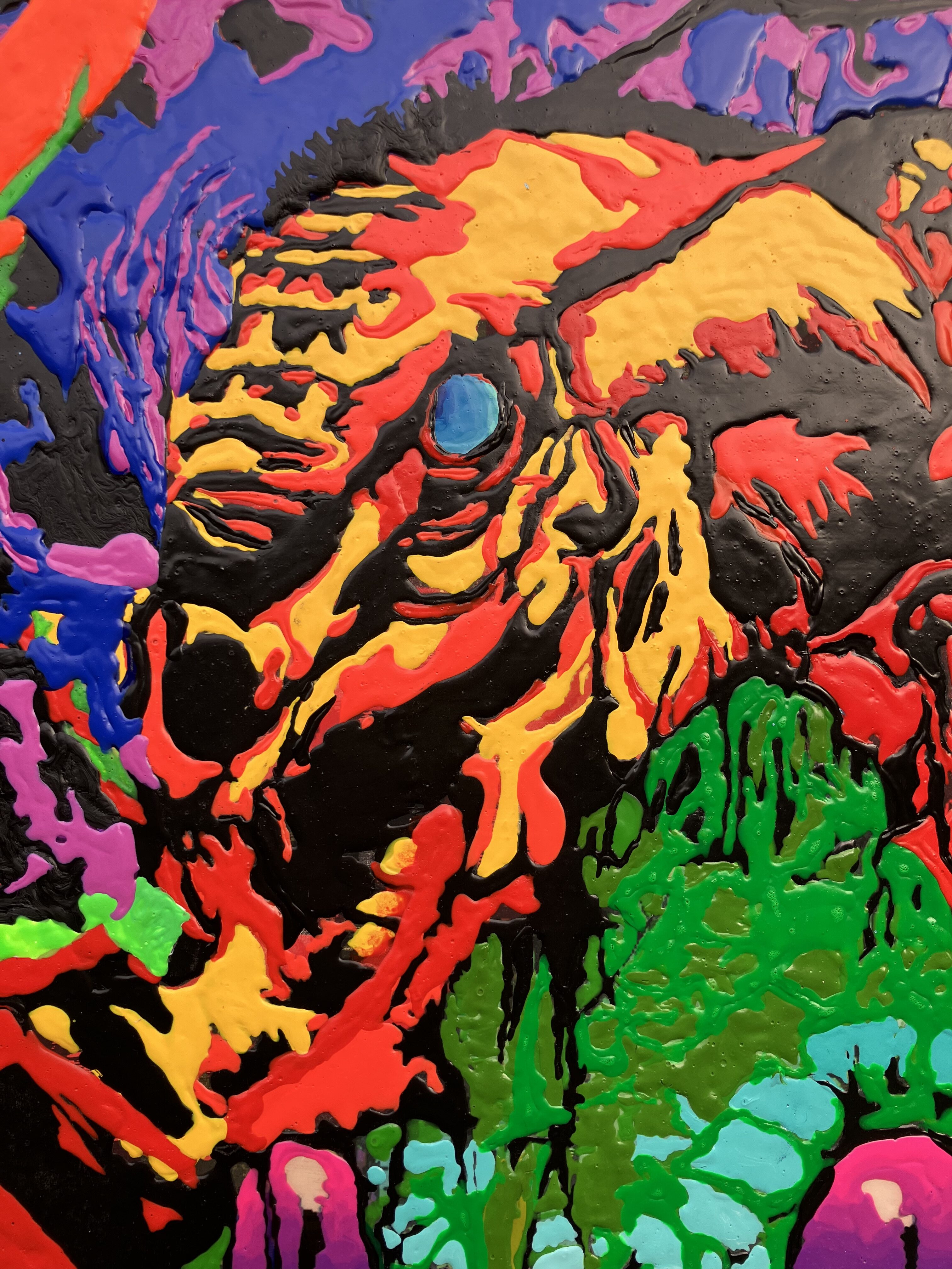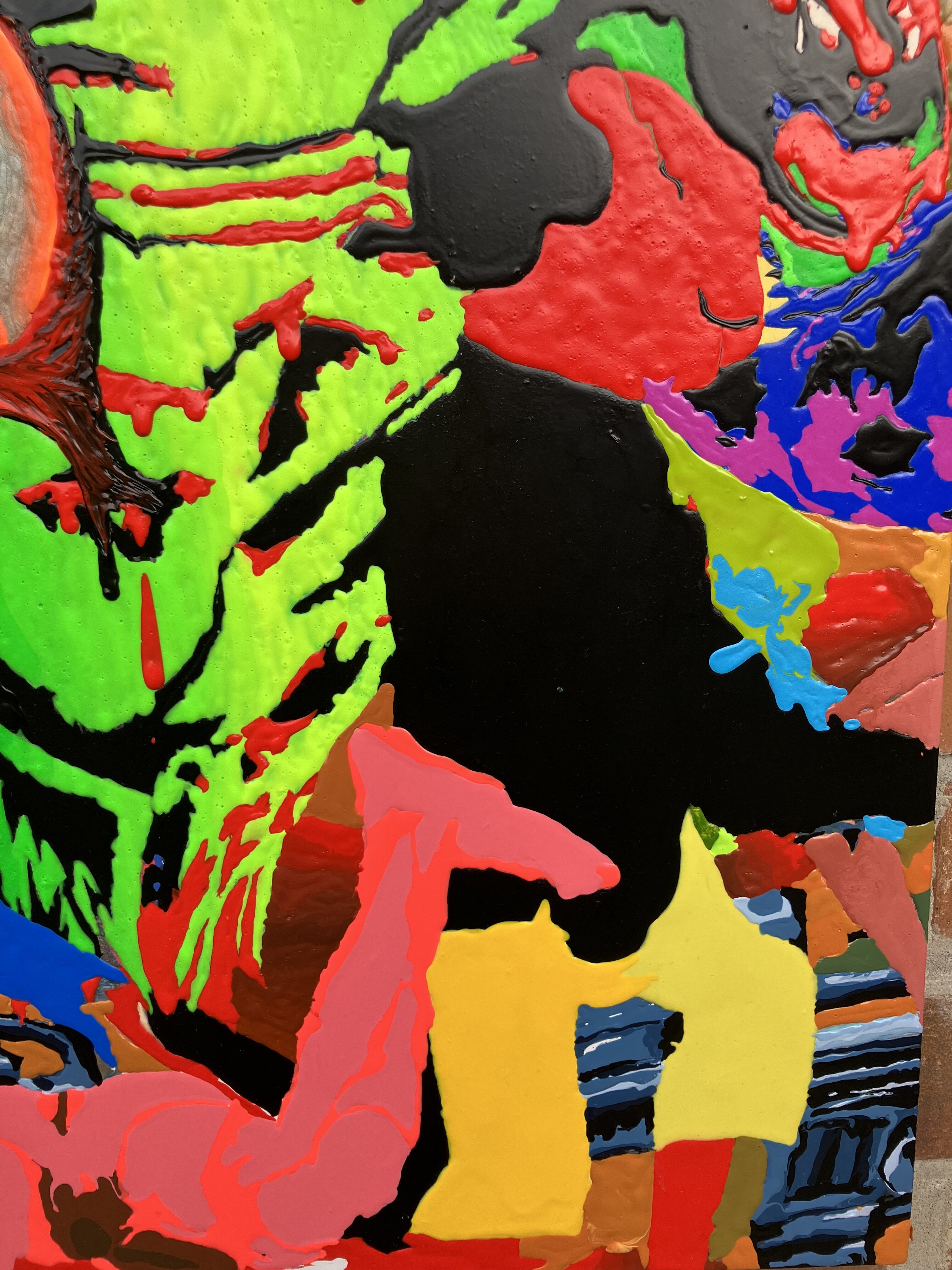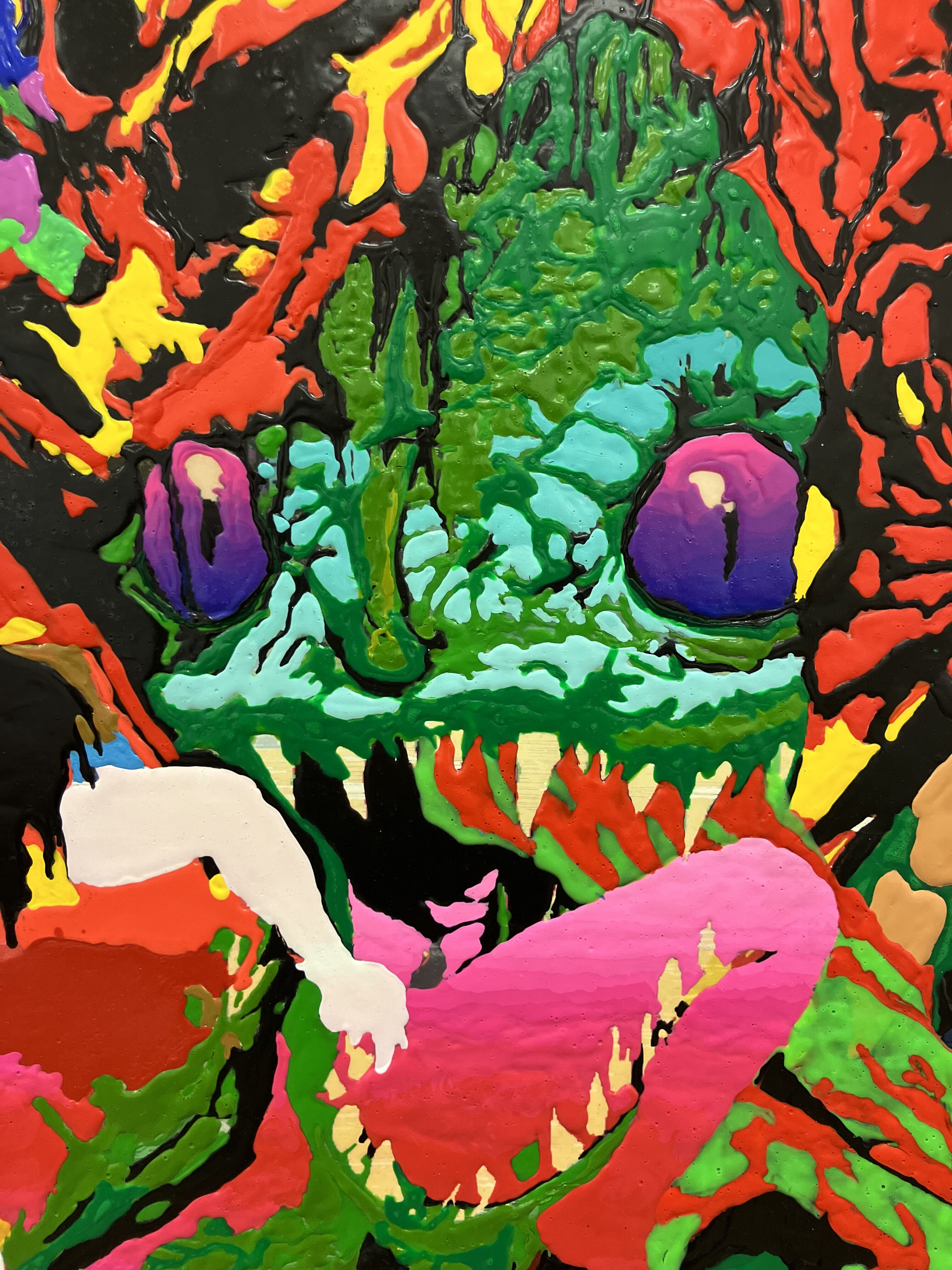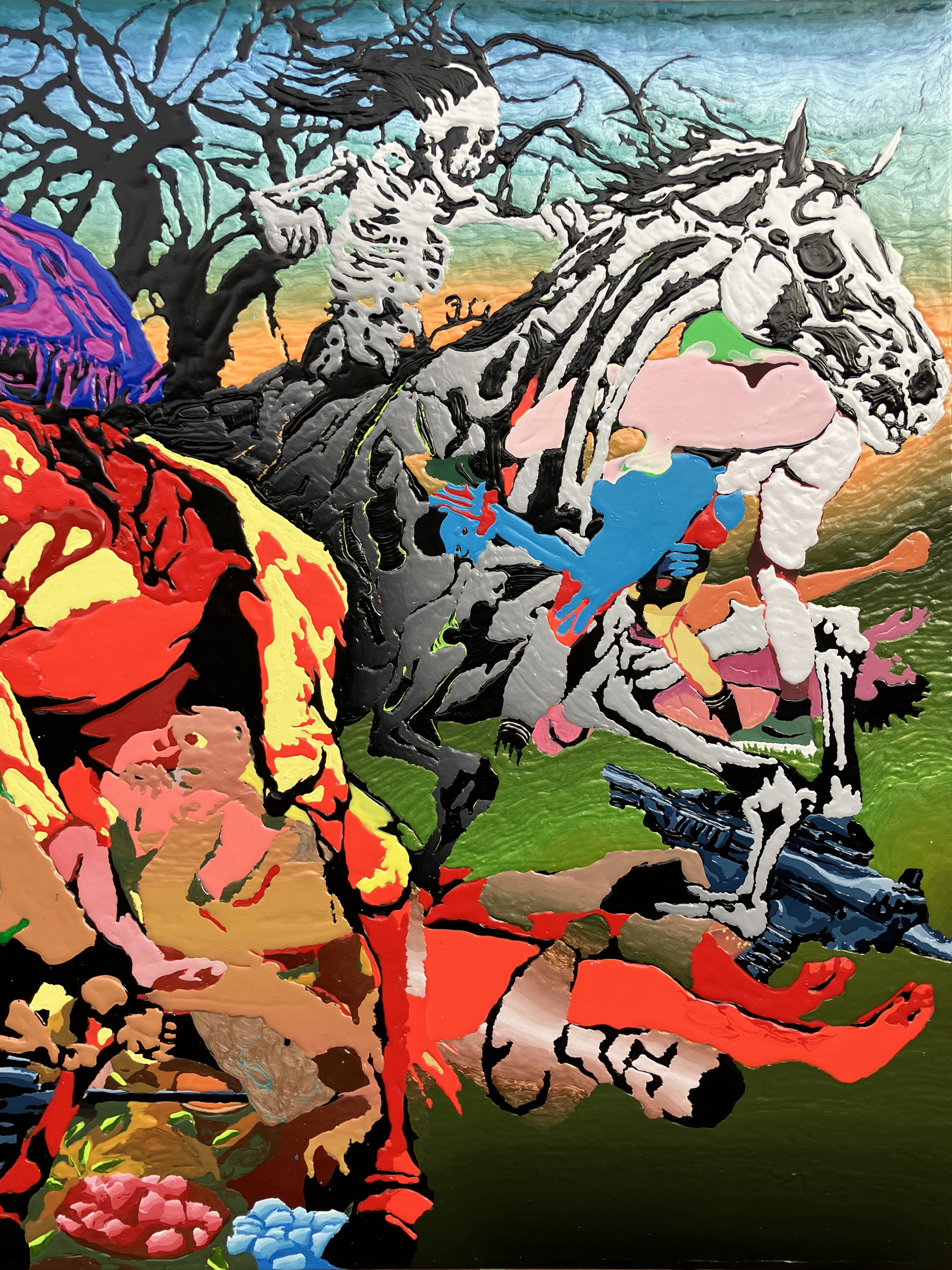 Movement through Dragons is organised with near-administrative calm. One passes from neutral daylight into jungle and canopy, into an environment of foliage and shadow; steps over rusting machine guns and candy—objects associated with labour and nourishment, now equally inert—and is guided, with little room for deviation, toward an atmosphere already determined by the paintings themselves. A catalogue of degradations accumulates: defaced bodies; snakes; death riding its skeletonised horse; shattered limbs; acts suspended between sex and violence; consumed bodies; frogs; eyes staring from openings. The effect is not escalation but fatigue. What disturbs is not the extremity of what is shown so much as the position the viewer finds themselves occupying.