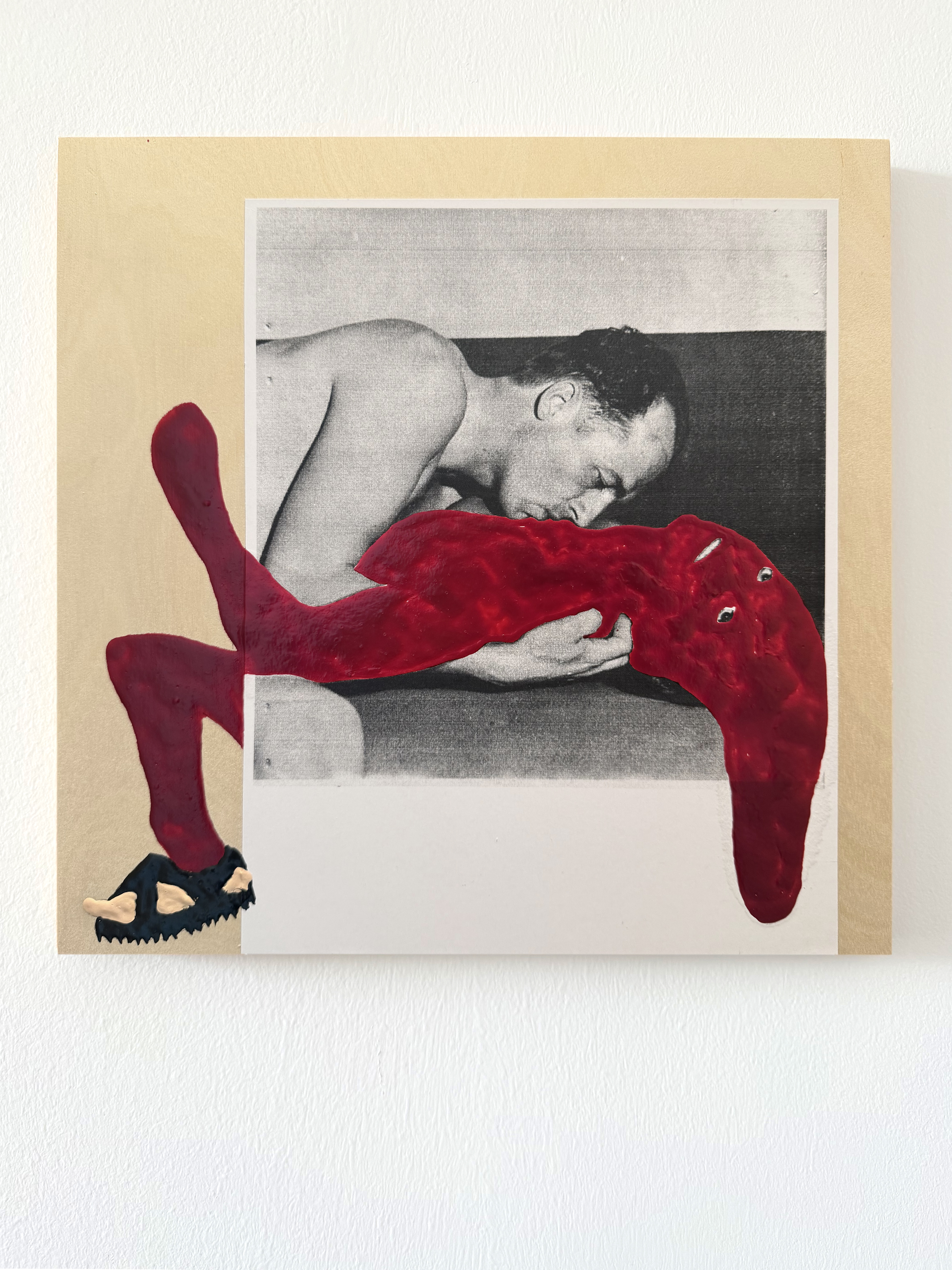 What’s immediately striking is that the red form has regained a kind of mobility. It stretches laterally across the image, bridging the photographic body and the board’s edge. It no longer reads as something simply borne or held; it behaves like something that is half-leaving, half-attached. The gesture is transitional rather than resolved. The reappearance of the shoe—now singular—matters. Unlike the earlier Funny Shoes, this one is not symmetrical, not balanced, not even properly paired. The lone sandal introduces incompleteness rather than comedy. It looks provisional, leftover, or mislaid. It is not footwear as identity; it is footwear as evidence. Erotically, the image is quieter than Funny Shoes but more uneasy.